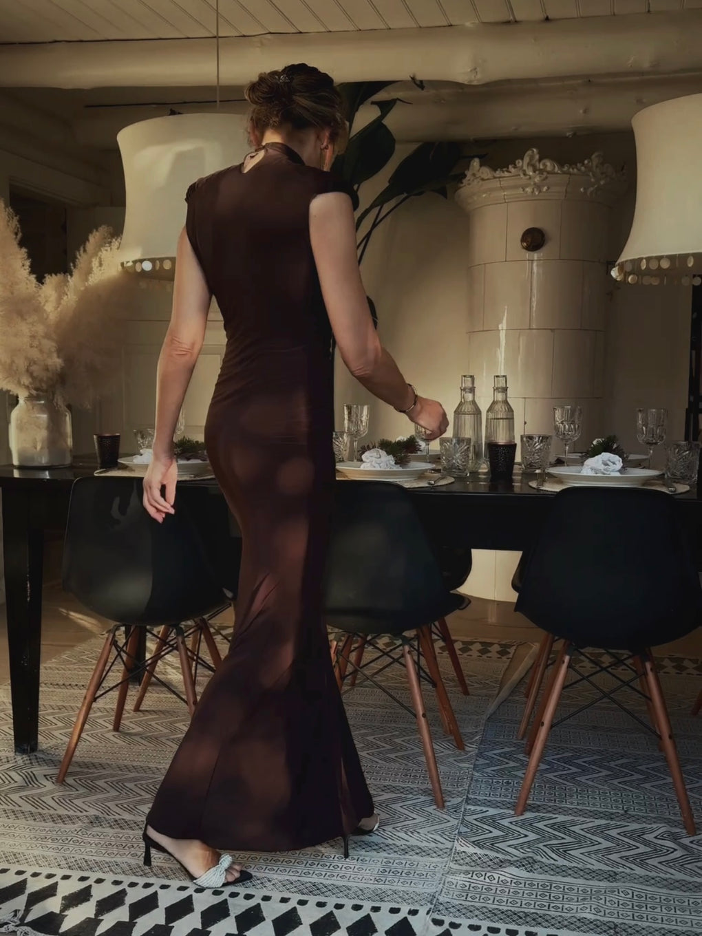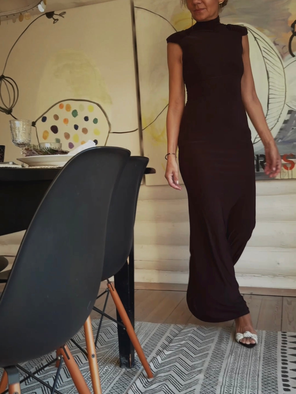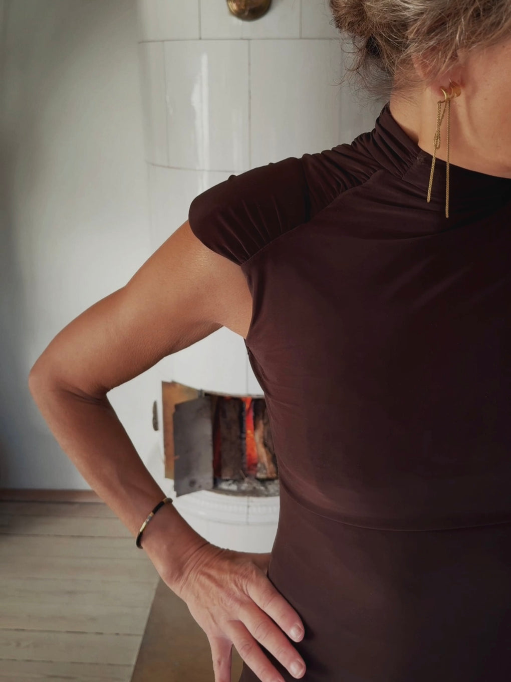 LONG SLIM DRESS WITH SHOULDER PADS - BROWN